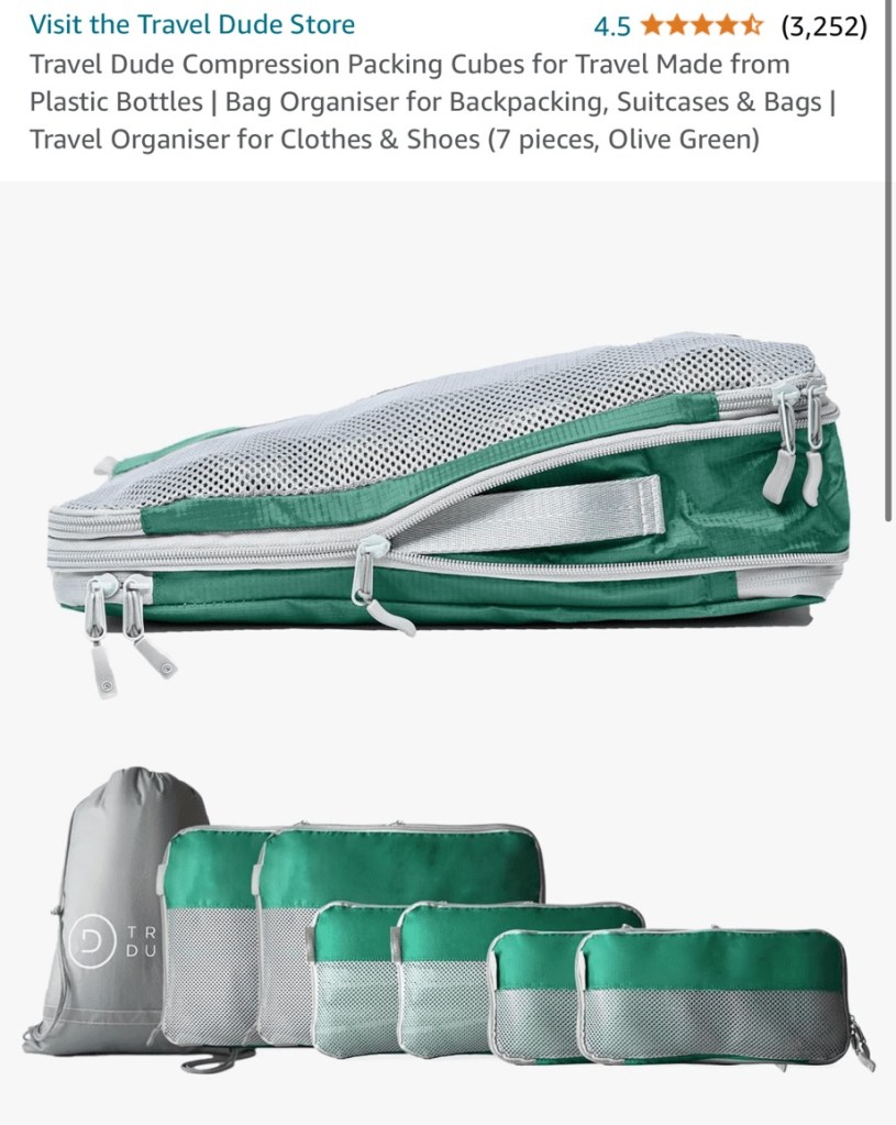 These were all over backpacking TikTok too so I thought we would give them a go. They’re very useful for keeping everything organised in our bags. The fact that they compress means it reduces the space it takes up inside the bag. Overall pretty good.